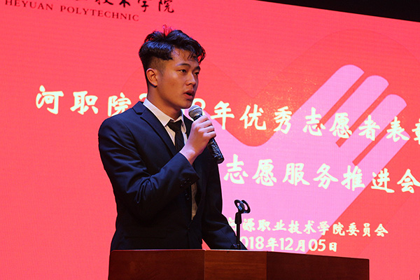 大会在庄严的国歌声中拉开帷幕。接着,在王波副书记宣读2018年我校优秀志愿者表彰决定后,汤剑冰副主席、陈晓峰书记上台为优秀志愿者颁奖。随后,各优秀志愿者代表分别上台发言,他们均结合自身实际经历及岗位分享了自己的志愿心得,并承诺将继续坚守自己岗位,积极投身志愿服务活动,为志愿服务活动及河源创文奉献青春力量。紧接着,赖新优部长为禁毒防艾志愿服务队、美丽乡村墙绘志愿服务队授旗。最后,大会在全体奏唱团歌中圆满落幕。