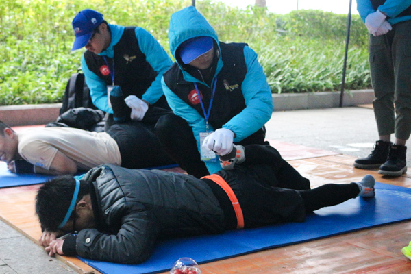 志愿者为参赛选手拉伸放松