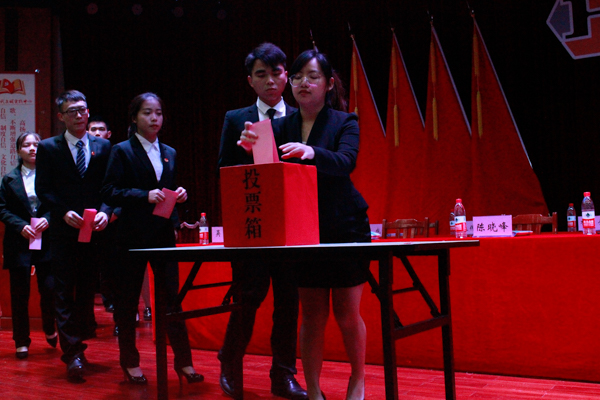 讨论结束后,全体学生代表返回艺术楼演播厅,并以举手表决的方式选举产生34名mksports官方网站登录入口第六届学生委员会委员。随后,在mksports官方网站登录入口第六届学生会第一次全体会议中审议并通过《mksports官方网站登录入口主席、副主席选举办法》。在介绍完主席、副主席候选人的基本情况后,代表们进行了投票选举。在大会闭幕式上,总监票人通报了选举结果,由李慕史担任mksports官方网站登录入口第六届学生会主席,戴蓉、刘海庭、丘声超、丘婷秀、吴博婉、徐榕晟担任mksports官方网站登录入口第六届学生会副主席。随后,新当选的学生会主席李慕史发表就职讲话,表示将带领好队伍,担负起责任,做好桥梁,全心全意为同学们服务。最后,本次大会在庄严的团歌声中落下帷幕。