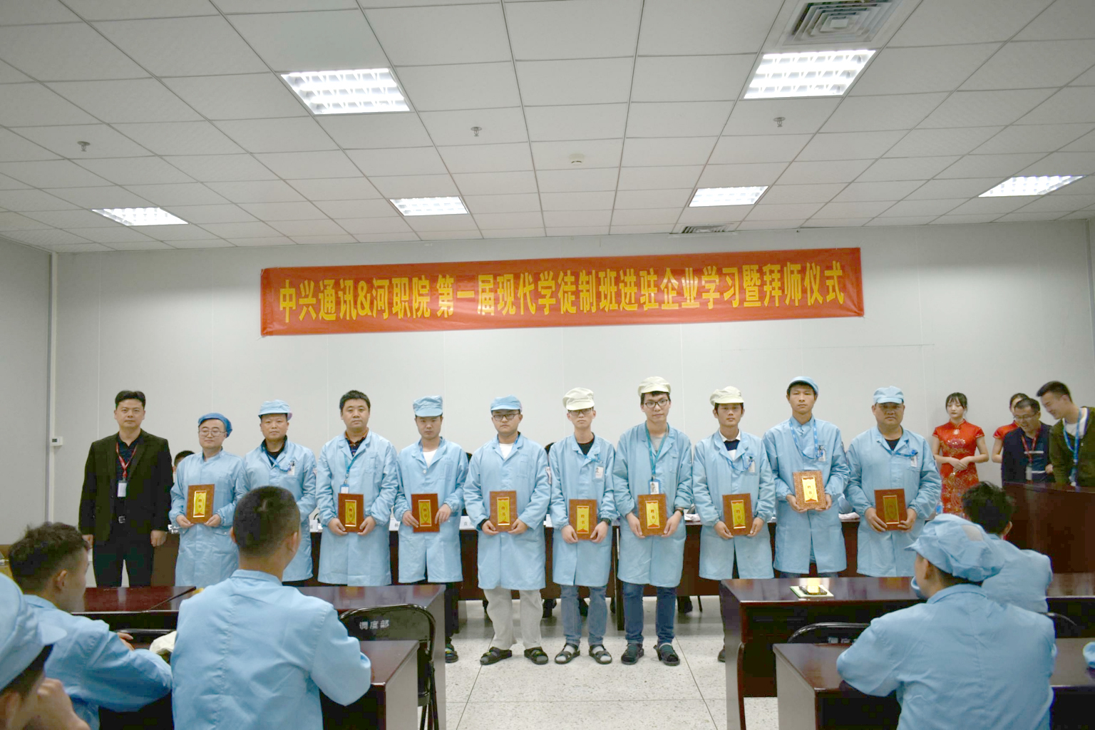 仪式上,周永福副院长对学徒制班基本情况做了介绍;杨黎院长为企业师傅颁发了聘书;在校企双方领导的见证下,“河职院&中兴通讯现代学徒制班”17名学生向11名中兴通讯的师傅行拜师礼、敬拜师茶,师徒双方签拜师贴、回徒贴,公司还为学徒进行了赠书。