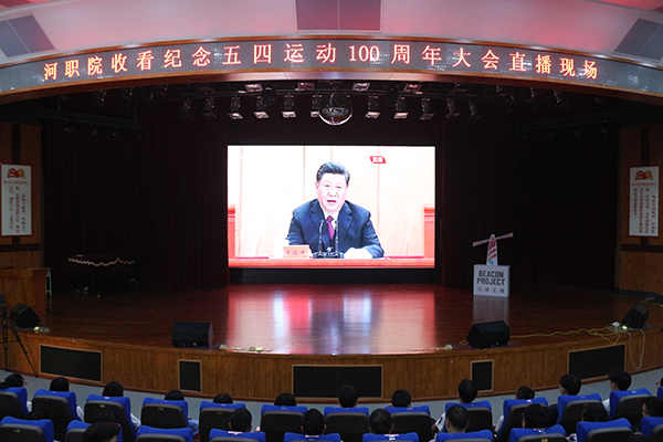 4月30日上午,纪念五四运动100周年大会在北京人民大会堂隆重召开,习近平总书记出席大会并发表重要讲话。学校党委书记韦荣、校长陈德清和其他学校班子成员及部门负责人在学校第一会议室收看直播,学校团委书记陈晓峰,团委全体老师、思教部教师代表,各二级学院团总支书记以及各学院团干团员代表300多名在艺术楼演播厅参加此次收看直播活动。