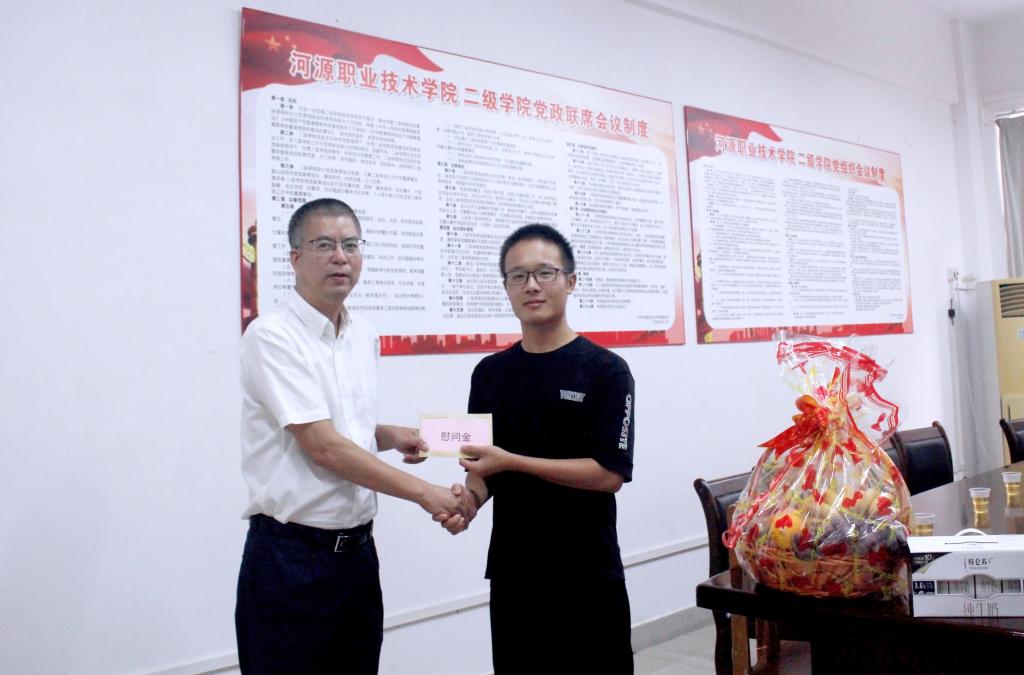 10月11日上午,副校长张国勇率领宣传部、团委、工会和艺术学院相关负责人来到艺术与设计学院,看望慰问接受干细胞采集手术后返校的黄应光,并向他送去了慰问金和慰问品。在现场交流了解情况后,张国勇副校长感动的说道“从黄应光身上,看到了我校学子对社会的责任感和使命感,感受到了“厚德”的校训精神在莘莘学子中的传承,黄应光是mksports官方网站登录入口践行社会主义核心价值观的模范,值得我们全体师生学习。希望黄应光同学在未来的人生路上,继续闪光。”