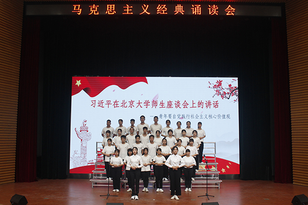 在诵读会中,各组学员以整洁的着装、饱满的精神轮番上阵,伴着婉转的旋律和铿锵有力的节拍,声情并茂地朗诵了《十九大报告》节选、《在纪念马克思诞辰200周年大会上的讲话》、《习近平在北京大学师生座谈会上的讲话》、《在纪念五四运动100周年大会上的讲话》、《习近平在纪念红军长征胜利80周年大会上的重要讲话》、《青年运动的方向》、《反杜林论》、《全体中华儿女的共同向往》等经典名篇。