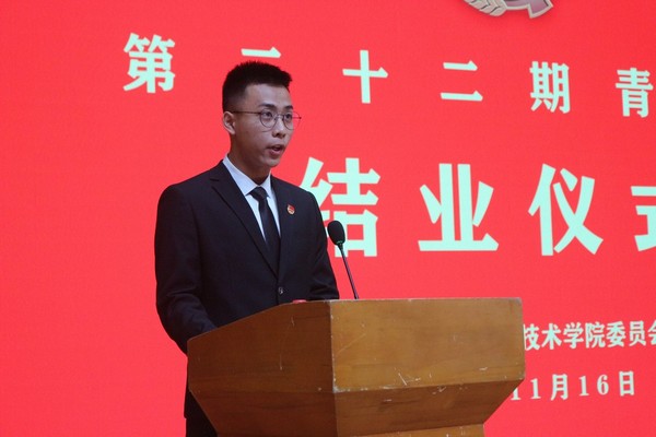 结业典礼在庄严肃穆的国歌声中拉开序幕。首先,陈晓峰书记为顺利结业的学员颁发结业证书,随后,优秀学员代表吴思灏、吴嘉仪上台发言,他们表示在今后的学习、生活中积极传递“聚是一把火,散是满天星”的青马精神,发挥“灯塔”作用,点亮自己、照亮他人,把周围的同学发动起来、团结起来积极加入到青年马克思主义者的队伍中来。最后,典礼在激昂响亮的团歌声中拉下帷幕。