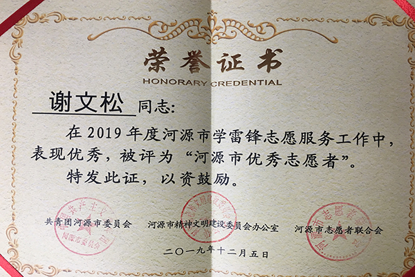 我校谢文松同学被评为“河源市优秀志愿者”