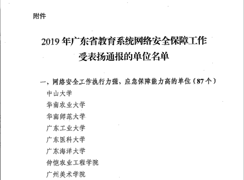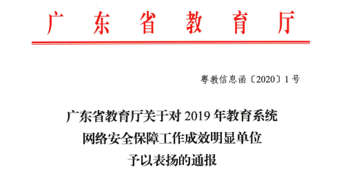 2020年1月3日,广东省教育厅发布《广东省教育厅关于对2019年教育系统网络安全保障工作成效明显单位予以表扬的通报》(粤教信息函[2020]1号),对2019年网络安全工作执行力强、网络安全保障工作扎实的单位予以通报表扬,我校位列其中。