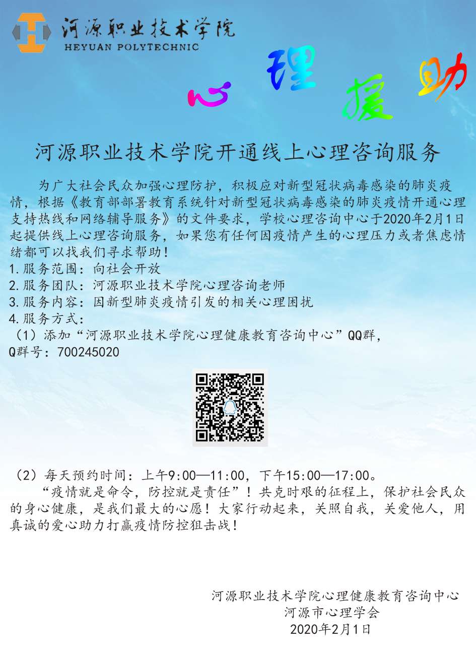 2月1日,学校会同河源市心理学会,对河源市志愿者开展“线上心理援助”服务的基本要求、基本心理知识、咨询原则和方法、线上心理危机干预与沟通技术等心理援助技能培训,并正式向社会发布“线上心理援助平台通道",开通线上心理援助,截止至3月24日,共有420次人咨询,其中严重抑郁者9人(均有自杀行为和倾向)在线上心理危机干预成功,效果理想。