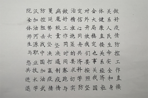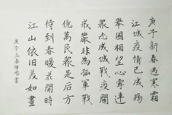 全体学生踊跃参与各项活动,向一线战“疫”英雄和白衣天使们致敬。学生们用心摘抄“习近平总书记对新型冠状病毒感染肺炎疫情系列重要指示”的硬笔作品,以骨气洞达,隽秀飘逸的字体表现出众志成城的家国情怀。在“为爱发声”抗击疫情朗诵活动中,作品《情牵武汉》富有韵味,声情并茂,与听众产生强烈共鸣,激发广大学子乐观向上的坚定信念。一首首激昂慷慨的诗歌《相拥在黎明破晓前》、《江城风雨》等作品震撼人心,用笔尖文字赞颂所有逆行者们的奉献精神。原创歌曲《不远春》唱出了对广大基层一线工作人员平安归来的期盼。