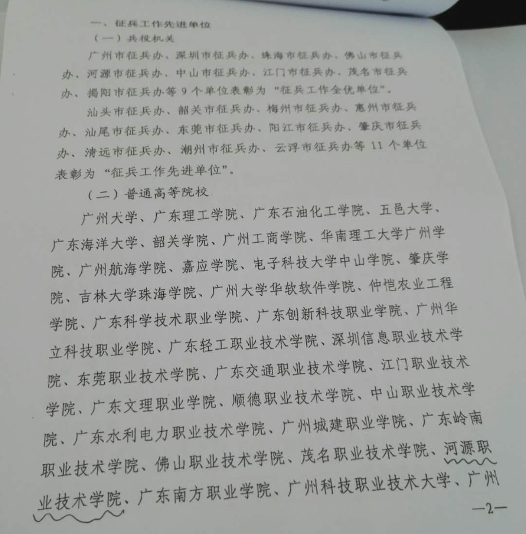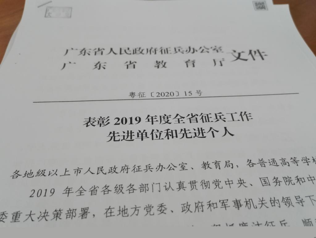 日前,从广东省人民政府征兵办公室、广东省教育厅印发的《表彰2019年度全省征兵工作先进单位和先进个人》(粤征〔2020〕15号)通知,mksports官方网站登录入口荣获“2019年度广东省大学生征兵工作先进单位”称号。学校已连续两年被广东省人民政府征兵办公室、广东省教育厅评为“广东省大学生征兵工作先进单位”。