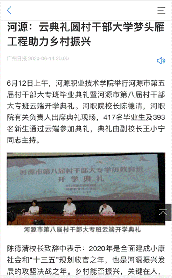 5、2020年6月15日,河源日报报道《圆村干部大学梦 助力乡村振兴》,报道链接网址:http://epaper.heyuan.cn/html/2020-06/15/content_2_6.htm