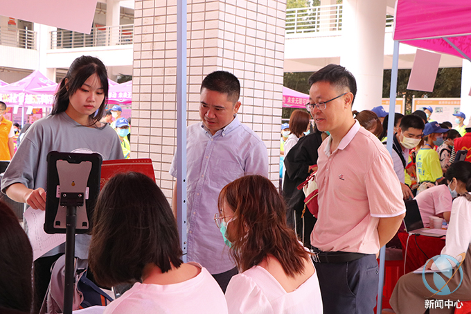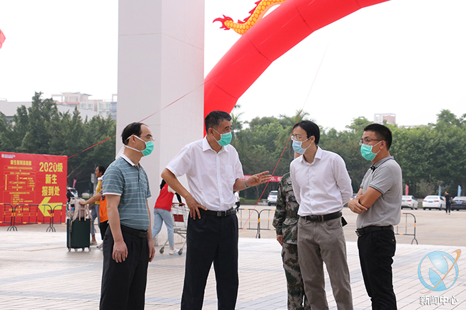 报到过程中,我校校长陈德清、副校长赖小景、副校长王小宁、副校长袁光华等校领导到中庭迎新报道点视察并通过自助迎新系统大屏幕实时观看新生入学情况分析。赖小景副校长表示,今年新生报到与往年有四大不同,一是时间推迟,比往年延后了一个月;二是错峰入学,按学院分批进行,总共分为五天时间报到;三是根据疫情防控的需要,我校参照其他院校的做法,谢绝了家长进校,新生到校后由学生志愿者帮助完成报到的各项工作;四是为确保迎新工作有序进行,学校今年还增加人脸识别系统,即新生要在本班报道点前进行扫脸验证,验证通过才算报到成功。