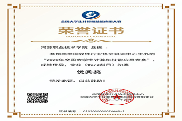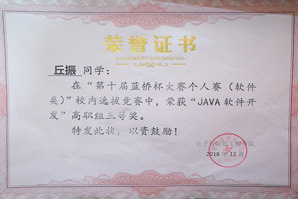 丘振同学在全国计算机技能大赛获得初赛优秀奖