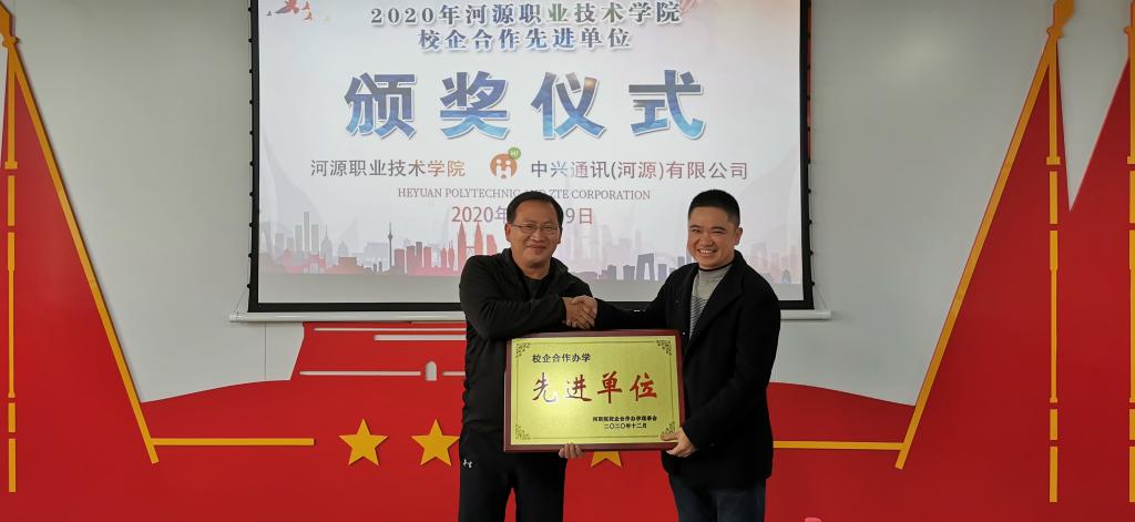 在接下来的仪式上,由袁光华副校长、 中兴通讯(河源)有限公司李新华部长和18移动通信技术1班的江仕良同学一起完成了第四届“中兴订单班”三方协议签订仪式,全体与会人员一起见证了三方签约的神圣时刻。接着,本仪式又举行了2020年mksports官方网站登录入口校企合作先进单位颁奖仪式,由袁光华副校长向中兴通讯(河源)有限公司李庆琰部长颁发了奖牌,现场响起了热烈的掌声。