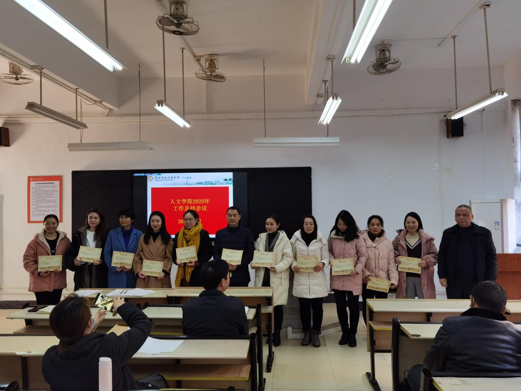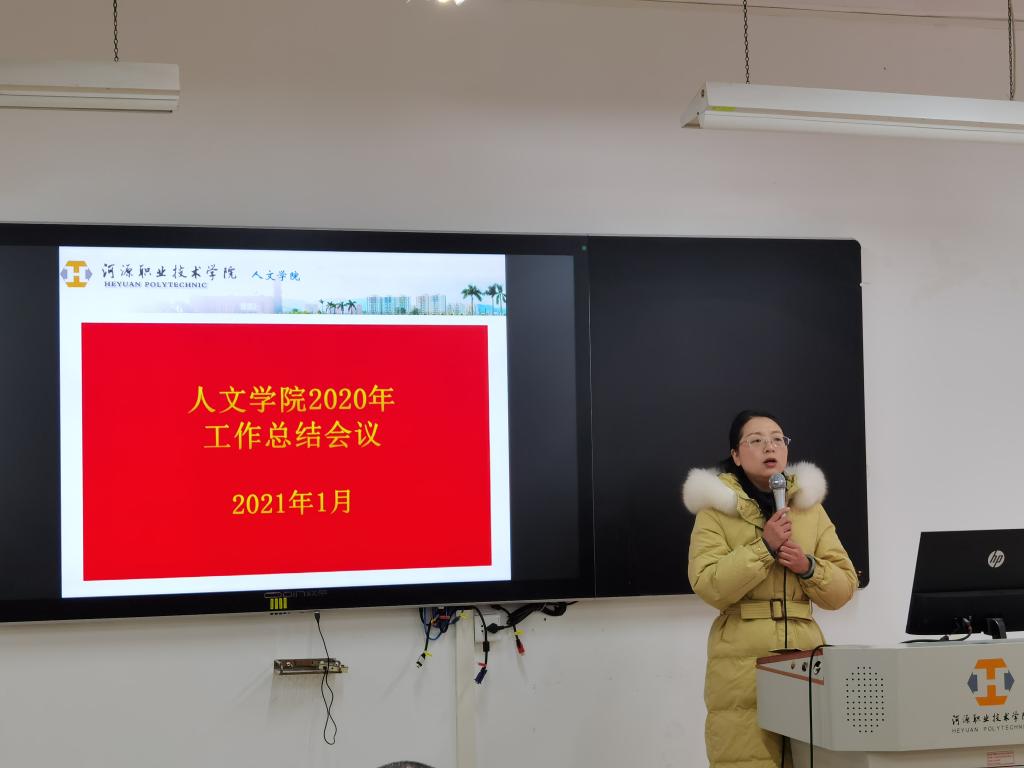 总结会上,人文学院3个教工党支部书记和11个部门、专业负责人分别就一年来的工作作了总结汇报。罗春娜院长对人文学院一年来的工作作了总结发言,对学院今年在科研、师生竞赛、学生工作等方面的突出成绩表示了肯定,号召学院教职工在新的一年,要更有新的作为。新的一年,每个人都要恪尽职守,勤勉工作,不辱使命,不负重托;新的一年,做好学院“十四五”规划,大家团结协作,朝着一个方向努力,再创佳绩。