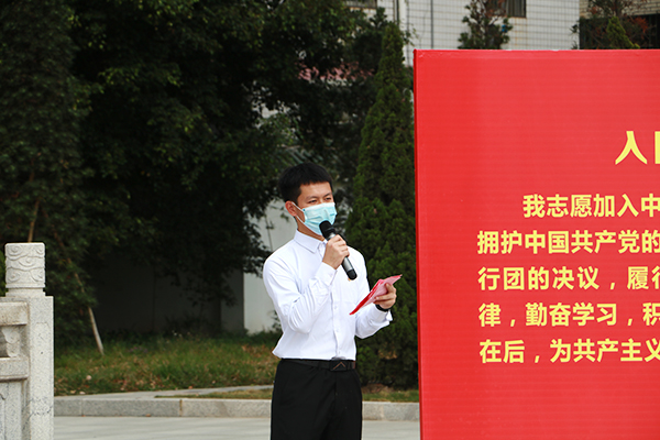 在全体肃立默哀一分钟后,在黄志远主任的带领下,全体师生重温入团仪式。之后陈晓峰书记寄语团员。我国现处于两个百年的重要交汇,作为共青团员要学习贯彻革命先烈忠诚坚定、不畏牺牲、艰苦奋斗、服务人民的优良传统。要弘扬中国精神、走好中国道路、凝聚中国力量,要永葆共产党人的红色基因,用好这一重要法宝,继承和发扬革命先烈的红色基因,不忘为人民服务的历史初心。练就过硬本领,确保我党的事业在红色基因传承中不断发展壮大,向着实现“两个一百年”奋斗目标不断前进。
