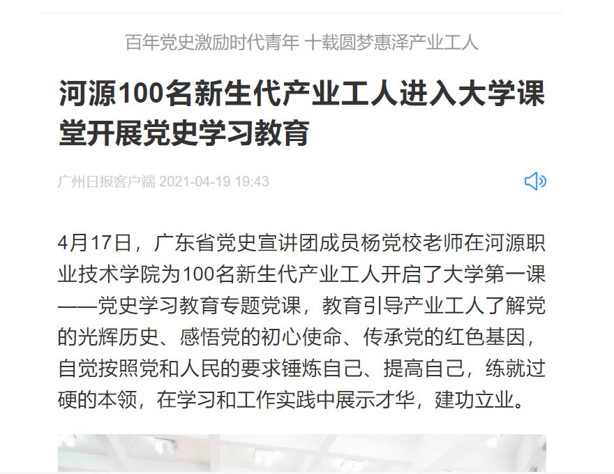 1、2021年4月19日,广州日报报道《河源100名新生代产业工人进入大学课堂开展党史学习教育》,报道网址链接:https://www.gzdaily.cn/amucsite/pad/index.html?id=1542864&site4=&columnID=0#/detail/1542864?site4&columnID=0