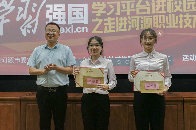 紧接着,进入到学习强国知识竞赛环节,12名参赛学生代表在10分钟之内答题挑战,决出一等奖1名,二等奖2名,三等奖3名。竞赛结束后,主持人与台下学生进行现场答题互动,学生观众们踊跃参加,积极抢答,现场气氛热烈。经过工作人员的精准计算,竞赛得分名次也随之公布,由刘烨洲副社长、副总编辑为三等奖颁发奖品及证书;由陈晓峰书记为二等奖颁发奖品及证书;由俞立峰科长为一等奖获得者颁发证书。最后,本次活动在出席领导、工作人员与学生代表的合影留念中落下帷幕。