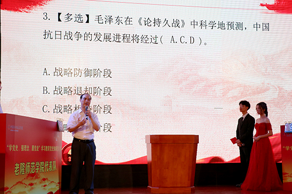 此次竞赛设置了必答题、共答题、抢答题和风险题四个环节,内容涵盖了中国共产党历史、中国共产党历史论述摘要、习近平新时代中国特色社会主义思想学习问答和中国共产党简史等。活动现场,选手们沉着冷静,积极作答,同时,带领了现场观众通过一道道党史题回顾了百年党史的艰辛与光辉,感受了中国共产党迎难而上,自强不息的伟大精神。竞赛结束后,赖小景副校长对本次竞赛的题目进行了详细讲解,让选手及现场观众更加了解党的历史和党的精神。此外,赖小景副校长还鼓励同学们要积极学习党的历史,坚定党的理想信念,让党史学习融入于青年大学生的生活之中。