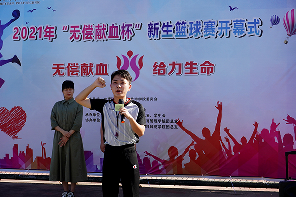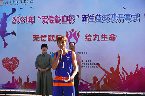 开幕式上,裁判组代表和运动员代表先后发言,表达了对赛事的期待与尊重,团总支书记杨日奎为赛事致辞,号召同学们弘扬体育精神,赛出河职院人的自信与风采。市中心血站党支部书记杨启兴宣布2021“无偿献血杯”篮球赛正式开始。