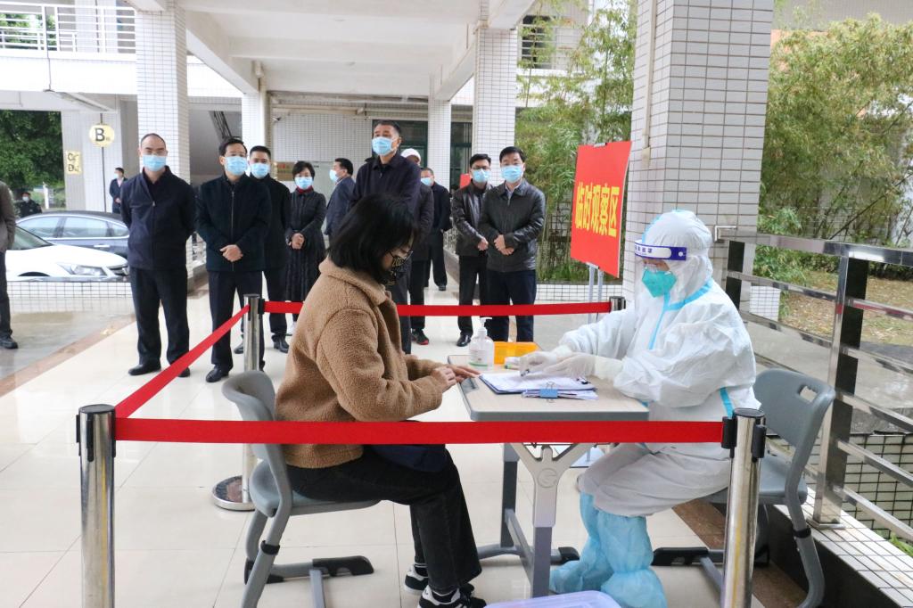 为做好新冠疫情疫情常态化防控下的开学准备工作,2月17日上午,校领导韦荣、陈德清、叶国英、赖小景、王小宁、袁光华带领相关部门负责人对开学工作进行了全面检查。检查组一行先后走访检查学校西门、南门、饭堂、东门、教学楼等防疫重点区域,了解疫情防控措施落实、食品安全、门禁管理、学生返校准备等情况。同时,学校组织了学生返校防疫模拟演练,校领导一行现场观摩。