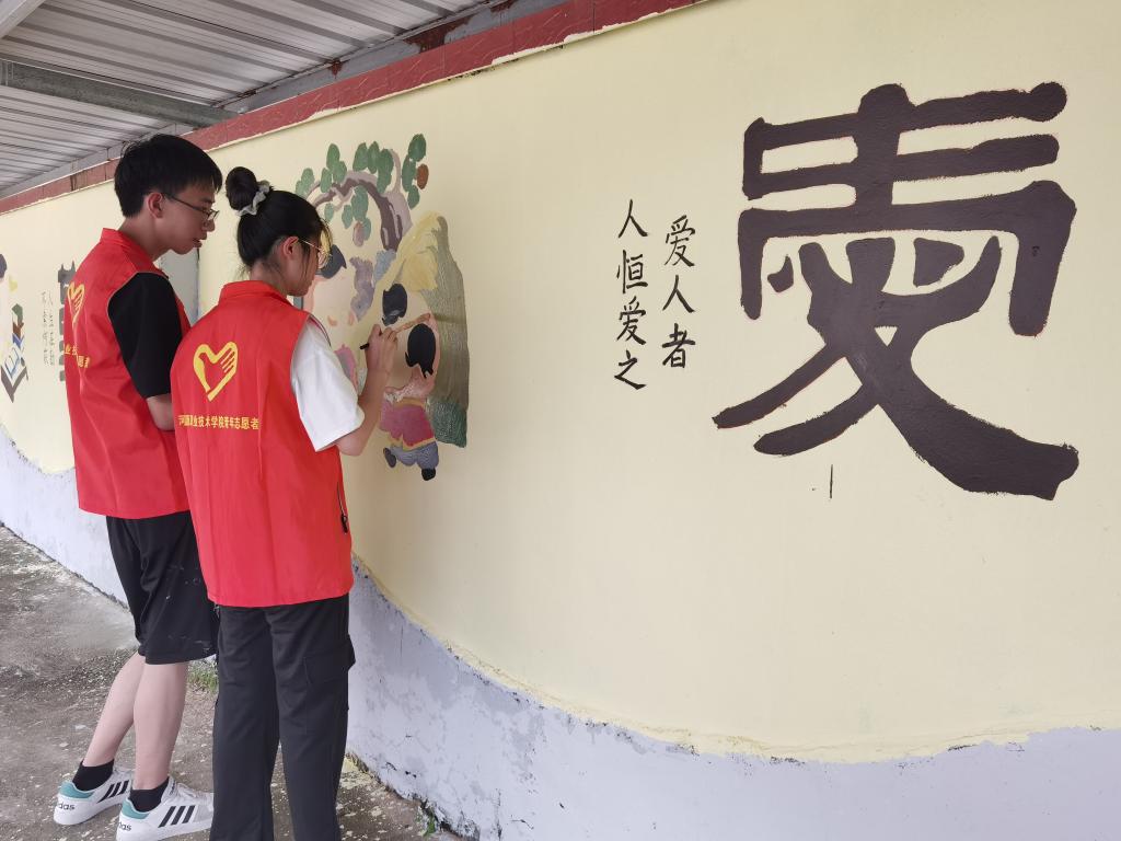 在紫金义合镇青水小学,墙绘志愿服务队队员共粉刷了7间教室以及两条楼梯、图书室外墙及校园内围墙约1000平方米,绘制了约150平方米的传统文化内容的墙绘。