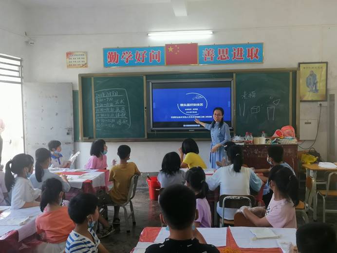 为了让瑶坑小学的同学们感受中国传统文化的魅力,培养热爱生活、热爱大自然的美学意识,帮助他们树立起传承发扬中华民族优秀传统文化的观念。7月8日上午,我校人文艺术学院教工第二党支部10名党员同志和“三下乡”志愿服务队一起,到赤光镇瑶坑小学开展了以“党建引领 传承发扬中华民族优秀传统文化”为主题的暑期专项活动,为瑶坑小学的学生们带来了两堂别开生面的美育实践课——植物拓染和墩头蓝织染技艺课。