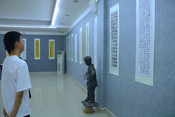 此次展览作品均出自我校学生之手,用楷草隶篆不同书体精心创作,风格多样,精彩纷呈。展出期间,一幅幅精美的书法作品吸引了许多学生和领导驻足欣赏、品味,他们无不为这些书法作品的深厚艺术功力所折服。