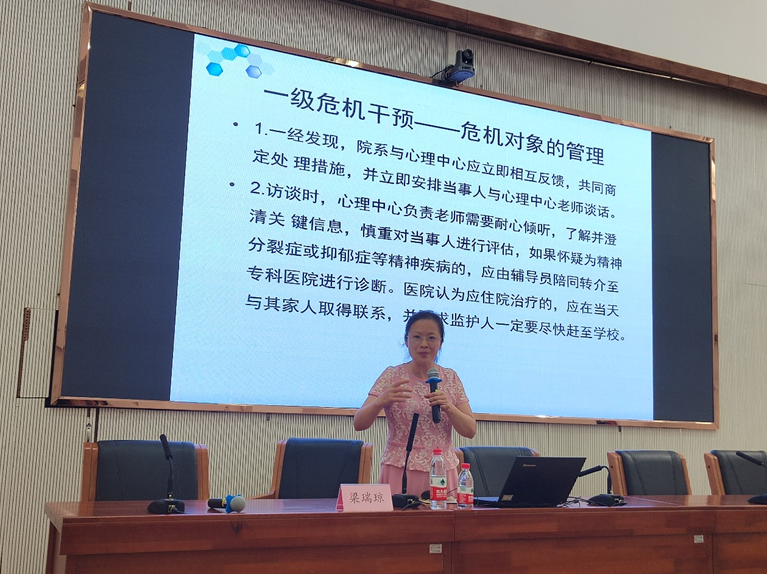 9月4日下午,我校特邀广州中医药大学梁瑞琼教授为我校全体学工人员开展心理健康教育场景讲座,讲座主题为“学生心理访谈与危机筛查指引”,学校姚家芳副校长主持。