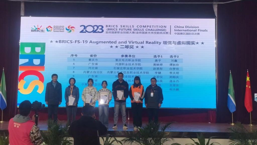 11月11日至14日,2023金砖国家职业技能大赛增强与虚拟现实赛项国际总决赛在湖北咸宁职业技术学院举行。来自全国各省市的37支职业院校参赛队同台竞技,我校模具设计与制造专业群派出的由刘俊英、梁丰两位老师及黄映婷、谭秋玲两位同学组成的参赛队代表广东省参加了比赛,经过激烈角逐,荣获全国二等奖的好成绩。刘俊英、梁丰两位老师被评为“优秀指导专家”。