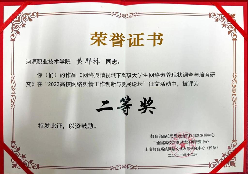 近日,教育部高校思想政治工作创新发展中心公布了“2022年高校网络舆情工作创新与发展论坛论文”获奖通知,我校黄群林老师撰写的论文《网络舆情视域下高职大学生网络素养现状调查与培育研究》获得二等奖。