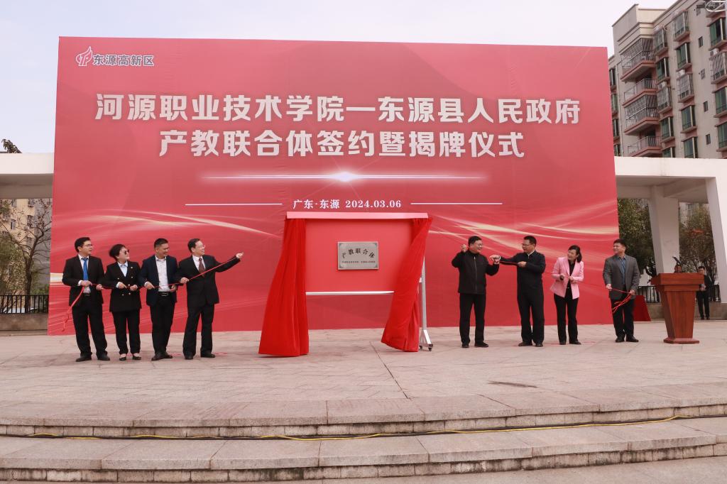 随后,东源县委书记秦卫民,副书记、县长刘大荣,副县长陈飞燕、卢帮燕,我校党委韦荣书记、袁光华副校长、姚家芳副校长、科研处处长廖远兵上台共同为产教联合体揭牌。