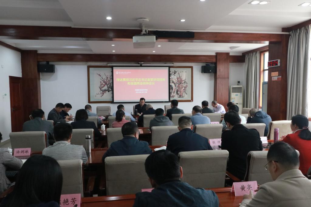 韦荣传达了习近平总书记在全国两会上的重要讲话精神和全国两会精神,以及政府工作报告关于教育的工作部署。他指出,这次全国两会是在新中国成立75周年、实现“十四五”规划目标任务的关键一年召开的一次十分重要的大会。习近平总书记在会议期间发表一系列重要讲话,高度肯定过去一年工作成绩,深刻分析国内外形势,就因地制宜发展新质生产力、全面深化改革开放、促进区域协调发展、加强生态环境保护以及营造干事创业的良好氛围等作出重要部署,具有很强的政治性、思想性、指导性。我们要深入学习领会,切实增强贯彻落实的思想自觉政治自觉行动自觉。