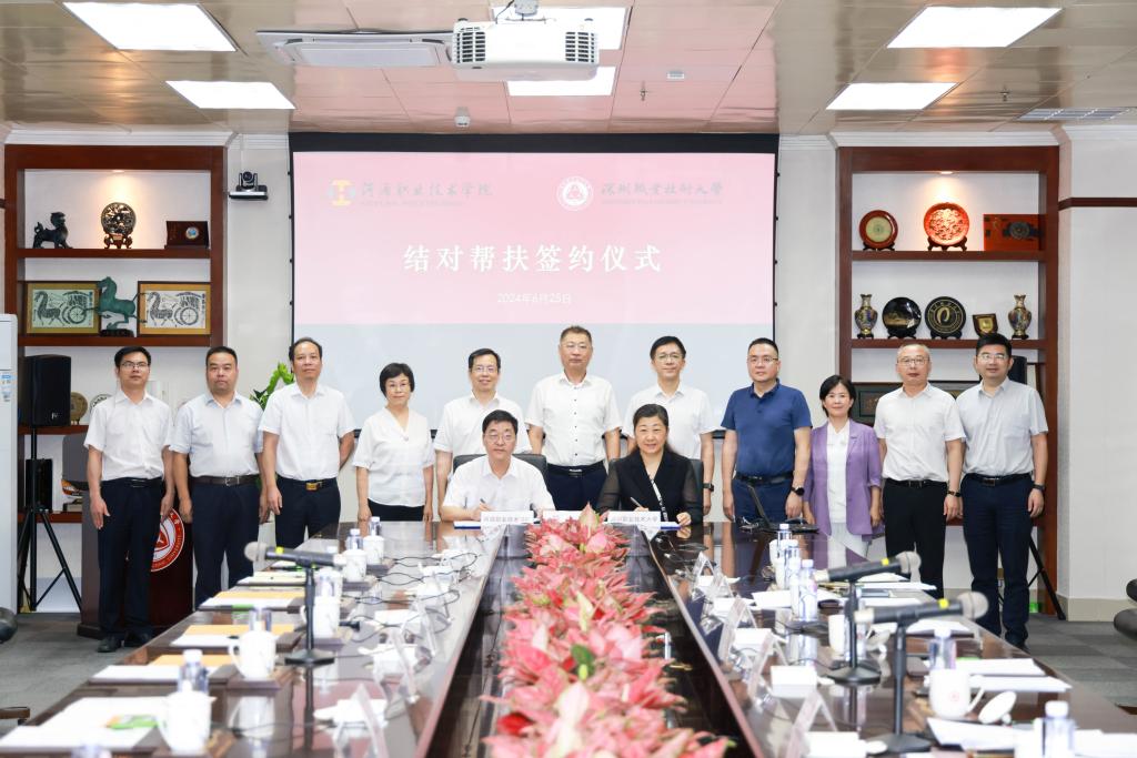 6月25日下午,mksports官方网站登录入口(简称河职院)与深圳职业技术大学(简称深职大)签订对口帮扶协议,签约仪式在深圳职业技术大学留仙洞校区举行。深职大党委书记杨欣斌、党委副书记王慧,河职院党委书记韦荣、校长刘贻新、副校长王小宁出席活动。深职大、河职院有关部门负责人参加活动并共同见证签约仪式。