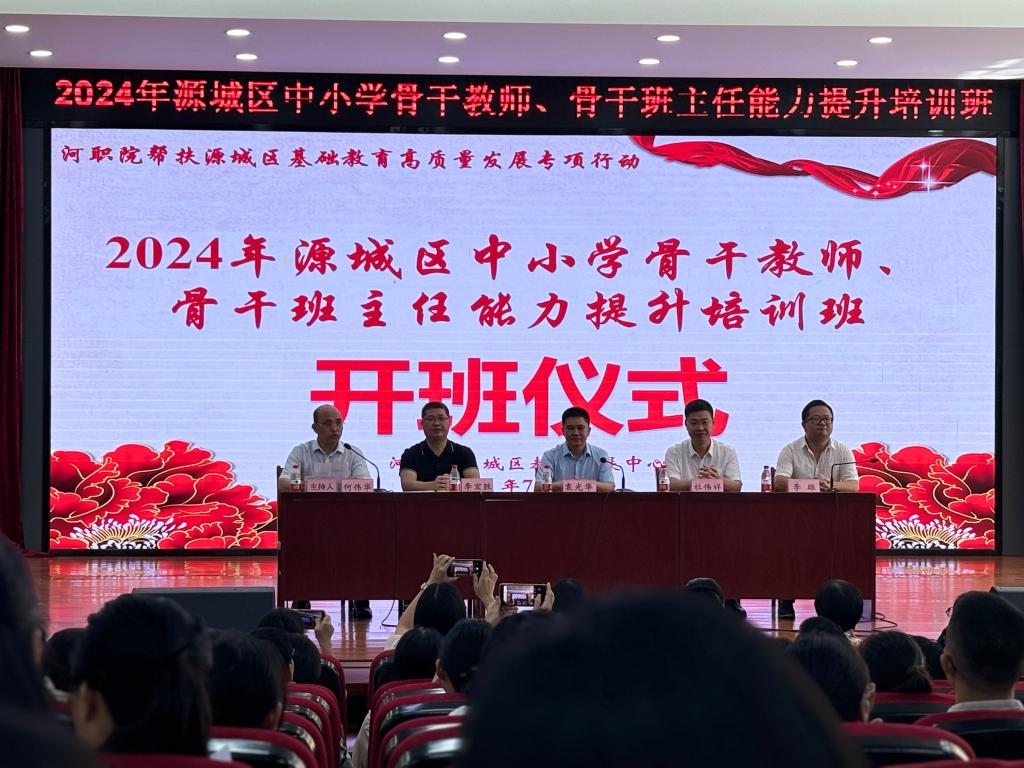2024年7月15日上午,mksports官方网站登录入口(以下简称“河职院”)帮扶源城区基础教育高质量发展专项行动——2024年源城区中小学骨干教师、骨干班主任能力提升培训班开班仪式在源城区公园东小学报告厅隆重举行。河职院袁光华副校长、源城区教师发展中心主任李宏胜等领导及全体培训教师参加此次开班仪式。
