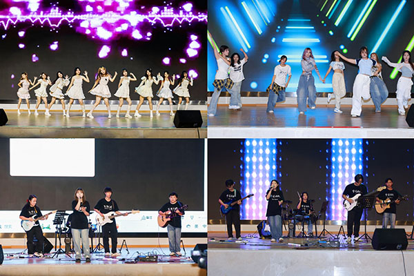 筑梦乐团、梦寐乐队用激昂的旋律为晚会拉开序幕,全场欢呼鼓掌声浪阵阵,尽显热情与活力。暖场歌曲后,韦荣书记等校领导共同上台为本届文体艺术节启动。