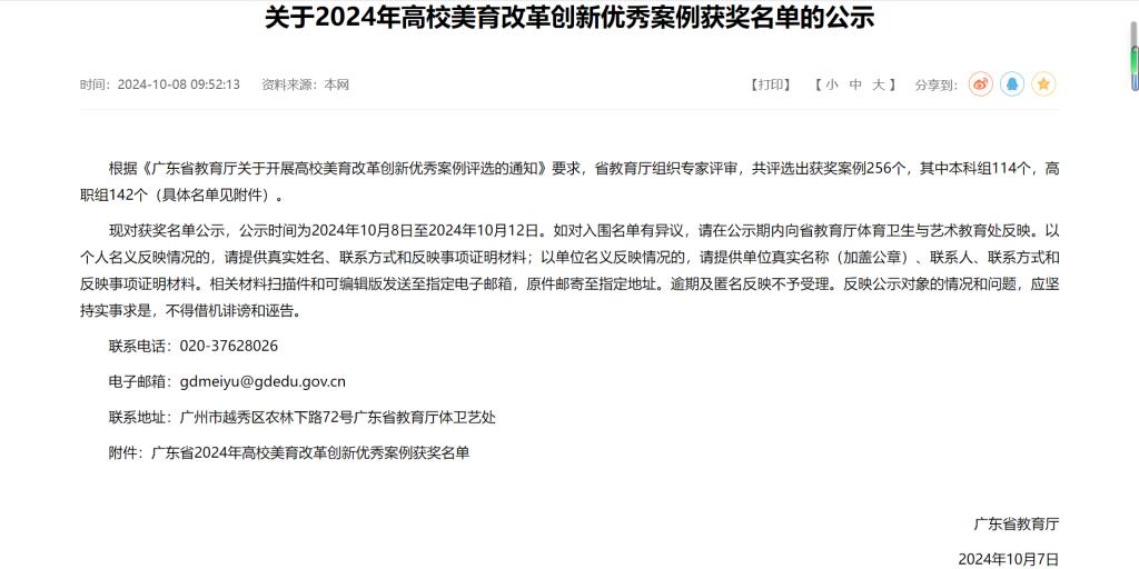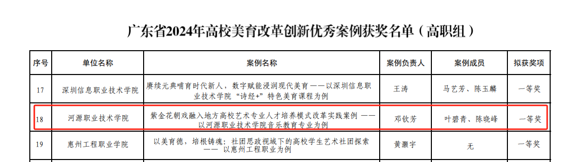 近日,广东省教育厅公布了2024年高校美育改革创新优秀案例的评选结果,共评选出获奖案例256个,其中本科组114个,高职组142个,我校推送的美育改革案例《紫金花朝戏融入地方高校艺术专业人才培养模式改革实践案例——以mksports官方网站登录入口音乐教育专业为例》获高职组一等奖。