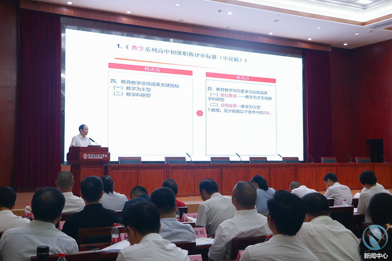 在会议上,学校党委委员、组织人事处处长黄建华从2023年职称评审概况、修订原则及修订内容等方面对《mksports官方网站登录入口职称评审制度文件》的修订情况进行了说明。该文件的修订旨在进一步规范和完善学校的职称评审工作,激励教职工提高立德树人水平、教学水平、学术水平及履行相应职责的能力。