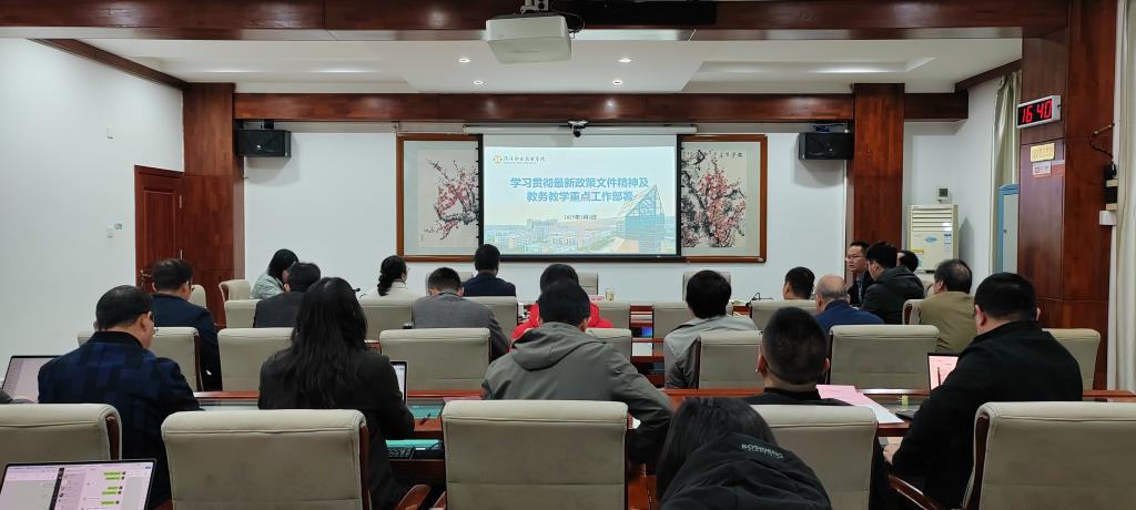 2025年3月6日下午,教务处在行政楼第一会议室组织召开2024-2025学年第二学期第1次教学工作例会。会议由袁光华副校长主持,会议以“教学工作高质量发展”为主题,围绕省域高水平学校建设、新国双专业群申报、教学管理优化等核心议题展开部署,为新学期教学工作指明方向。刘贻新校长,袁光华副校长,各二级学院正副院长,校企办主任及教务处相关人员参加会议。