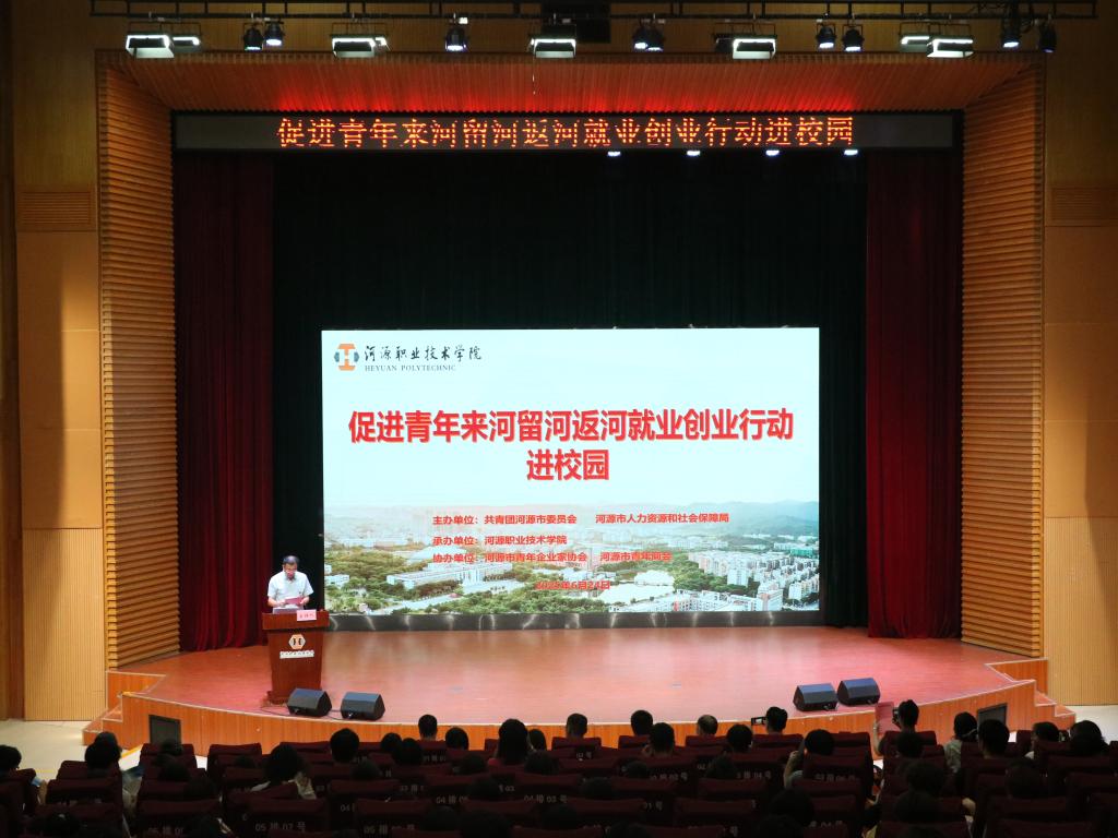 为贯彻“百千万工程”与“百万英才汇南粤”行动计划,助力青年就业创业,6月24日晚上,我校联合团市委在图书馆报告厅开展“促进青年来河留河返河就业创业行动进校园”活动。团市委副书记吕科、市人社局四级调研员杨建明、校团委书记陈晓峰、市青企代表、市青商代表、河职院优秀毕业生代表出席活动,400余名学生参加活动,校团委书记陈晓峰主持。