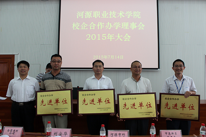 会议的第二项议程,对2014-2015学年中表现突出的广东三友集团等4个先进校企合作办学单位和吴良生等8名先进个人进行表彰。