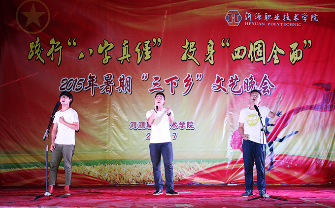 7月29日,我校在紫金县凤安镇中心小学举行2015年暑期“三下乡”社会实践活动文艺晚会。紫金县凤安镇副镇长李振兴、紫金县团委书记助理曾锐、紫金县团委办公室主任魏新福等领导嘉宾出席了晚会,参加晚会的还有紫金县凤安镇的父老乡亲们、觉民小学的学生、我校团委全体老师以及“三下乡”的志愿者们。