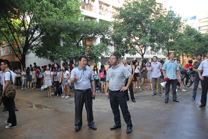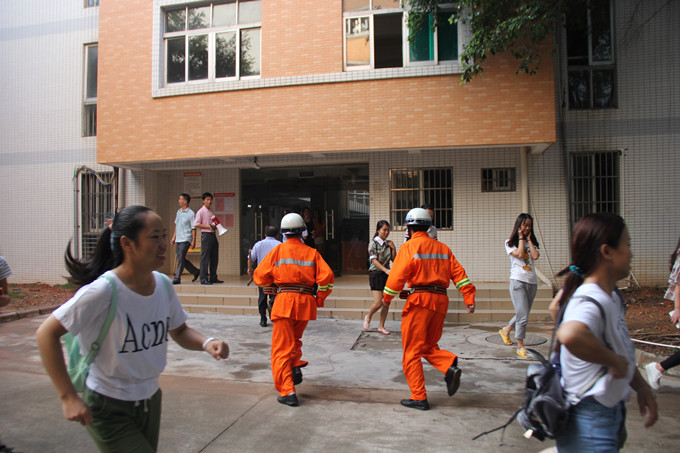 为增强2015级新生的消防安全意识,提高自防自救能力,9月23日下午,我校联合河源市公安消防支队在B区学生宿舍进行消防实操和紧急疏散演练。陈农心副校长、河源市公安消防支队文昌中队廖拓指导员,学工处、资产后勤处、人文学院和机电学院等相关部门人员出席演练现场。住在B区学生宿舍5栋的约1000名新生参加了紧急疏散逃生演练。