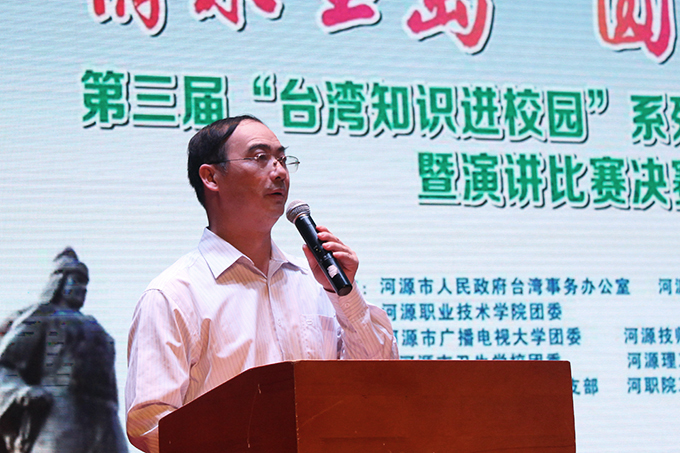 11月5日,我校于艺术楼演播厅举办主题为“情系宝岛,圆梦中华”的第三届“台湾知识进校园”系列活动启动仪式暨演讲比赛决赛。出席此次活动的有河源市人民政府台湾事务办公室主任谢昉柱、我校副校长赖小景、河源技师学院副院长刘俊侃、河源理工学校副校长叶恩胜、市内各院校教师代表以及我校各大学生组织社团代表。