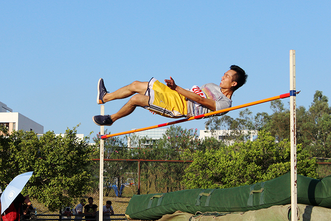 下午3点,学生组男子跳高决赛在足球场正如火如荼的进行,来自电信学院的刘志秋以1.61米的成绩勇摘桂冠。