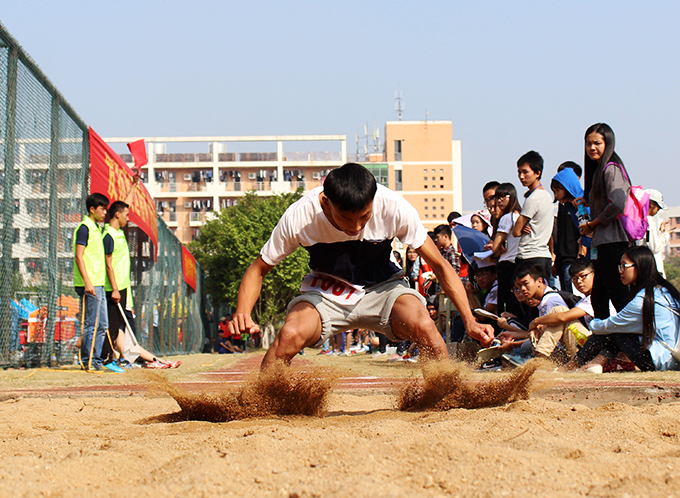 | 越向第一 子挥汗水,赛场出英豪学 骄阳似火,汗如雨下,虽是初冬时节,室外温度却高达30度。上午10点,学生男子三级跳远预决赛在田径场准时开赛。最终由艺术学院吴成峰摘下冠军。 预赛环节之后,进入决赛环节。选手们各展身手,表现出色。助跑、单脚跳、跨步跳、跳跃、落地,这一完美的动作组合在空中形成一条条弧线。最后,艺术学院的吴成峰以12米的成绩获得第一名,电信学院的陈文发和机电学院的陈创尾分别以11.78米和11.67的成绩获得第二、第三名。
