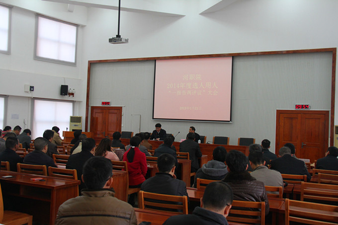 与会人员在认真听取了学校干部选拔任用情况报告之后,按照测评表的各项评议内容对2014年度学校干部选拔任用工作进行了民主评议。