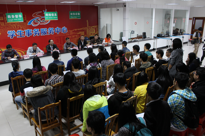 11月18日下午,我校在“马上办”学生事务服务中心开展学生约谈活动。赖小景副校长,后勤处、团委、宿管中心、中竣物业等部门相关负责人与学生们就后勤服务管理方面存在的问题,进行面对面讨论与交流。