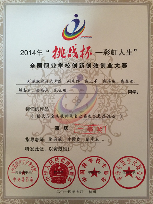 7月25日至28日,由共青团中央、教育部、中国科协、全国学联、浙江省人民政府共同主办的2014年“挑战杯——彩虹人生”全国职业学校创新创效创业大赛决赛在浙江经贸职业技术学院举行。经过3天的比赛,我校参赛队伍取得骄人成绩,获大赛总决赛一等奖。