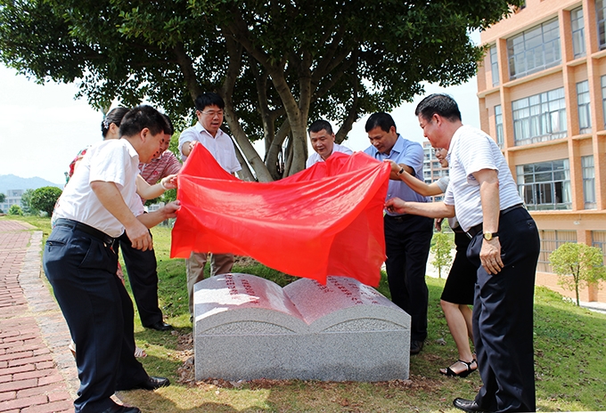 双方签订了助学奖教基金协议书,刘安华代表学校接受了越时投资有限公司100万元的资金捐赠,并共同为纪念石揭彩。