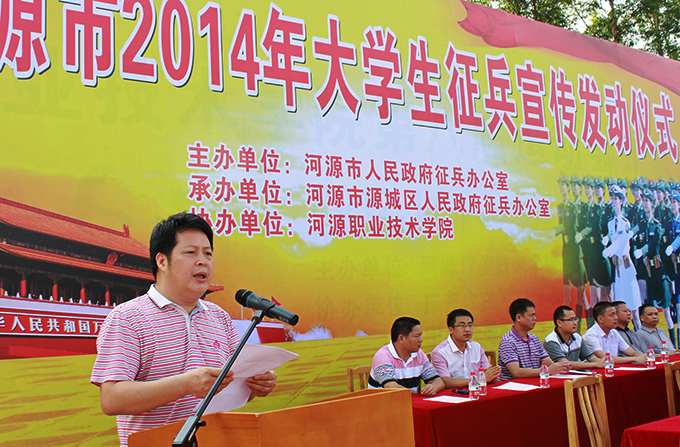 6月17日上午,河源市2014年大学生征兵宣传发动仪式在我校田径运动场举行。河源军分区参谋长武启龙大校、源城区人武部政委罗金柱上校、源城区人武部部长李琦,我校校长刘安华、副校长陈农心、学工处处长、各二级学院副书记、各学院学生代表参加了本次启动仪式。